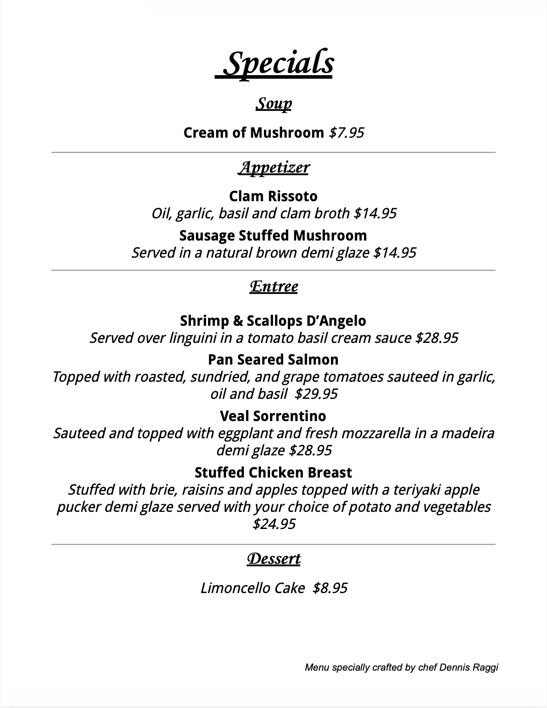 WEEKLY SPECIAL'S CRAFTED BY CHEF DENNIS RAGGI